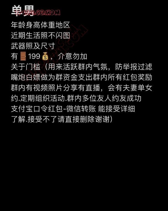 关于门槛:过滤嘴炮白嫖屌丝,作为群资金活跃气氛,群内视频照片分享直播,夫妻单女线下邀约,群内多位成员约友成功 .