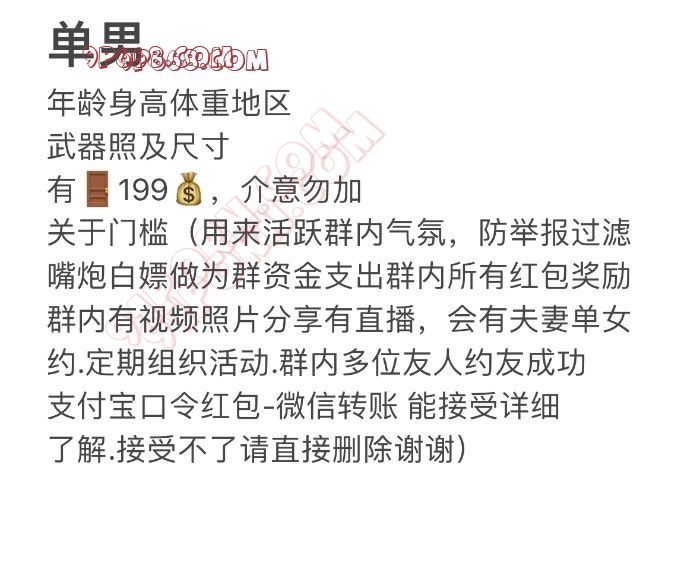 关于门槛:过滤嘴炮白嫖屌丝,作为群资金活跃气氛,群内视频照片分享直播,夫妻单女线下邀约,群内多位成员约友成功