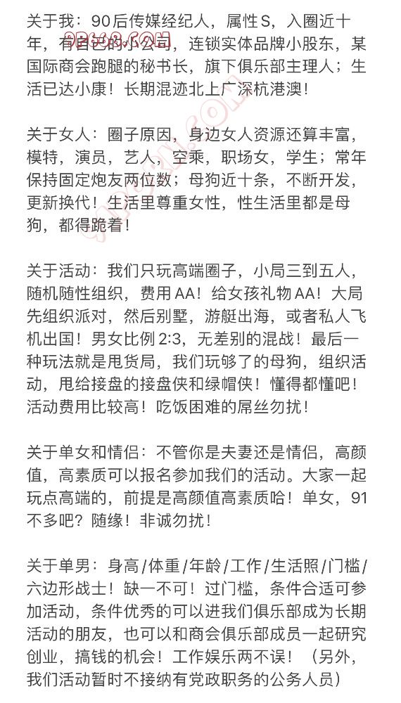 关于活动:我们只玩高端圈子,小局三到五人,随机随性组织,费用AA!给女孩礼物AA!大局先组织派对,然后别墅,游艇出海,或者私人飞机出国!男女比例2:3,无差别的混战!最后一种玩法就是甩货局,我们玩够了的母狗,组织活动,甩给接盘的接盘侠和绿帽侠!懂得都懂吧!活动费用比较高!吃饭困难的屌丝勿扰!