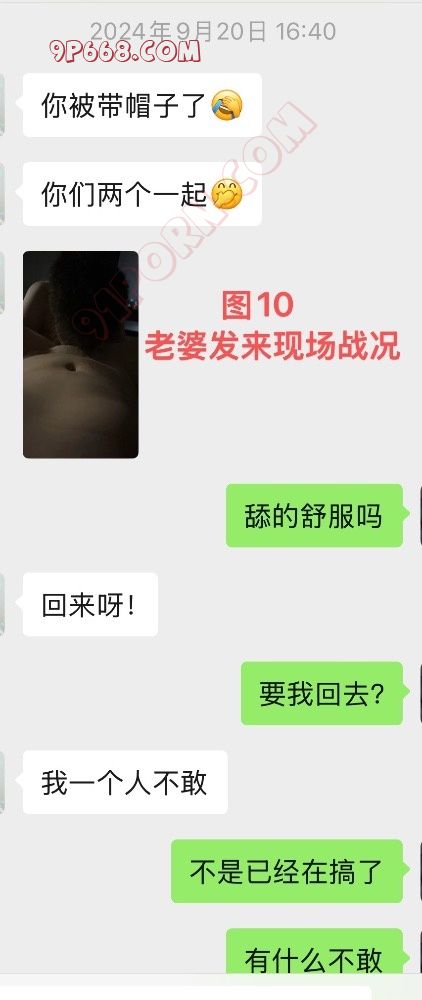 家里监控的视角正好对着沙发,所以我清晰的看着老婆一边打麻将,单男则坐在旁边一只手放在老婆大腿上,另一只手则伸进衣服里摸着老婆的大奶子。(这也是我事先和单男交代好的,老婆敏感度非常高,稍微一刺激就受不了,所以叫他一进房间就可以上手刺激老婆)。在这种情况下,很明显的看到老婆双腿一直糯动着,嘴里还一直叫单男停一下停一下之类,很明显她很想要了……由于当时没保存监控截图,所以这些画面就需要大家脑补了……终于在10几分钟后,老婆麻将结束了。刚好那时候我突然临时来了点小事处理了几分钟,处理好后赶紧重新打开监控,但他们已经消失在监控的视角里。不用想,他们已经是洗澡去了。果然,一会儿后,他们又重新回到监控里,然后进去了我们的卧室。因为我家监控只能拍到卧室里床尾一点地方,所以当他们进去后,我只能脑补画面了,但是当时这种感觉带给我的刺激不亚于前面9次的任何一次……我的老婆,正在和别的男人,在我的卧室,我的床上,发生着任何可能发生的事!而我正在小区停车场里坐在车里看着家里的监控!他们现在在干吗?是老婆在给他舔鸡巴?还是单男贪婪的抚摸着舔着老婆的大奶子?我脑海里想象着各种画面……没多久,老婆给我发来一条微信(见图10、11、12)。